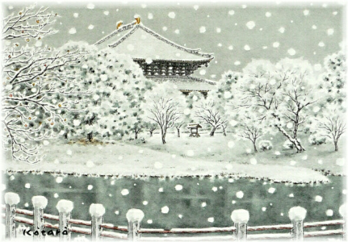色のあるところだけを描きすすめる ![]() ■ 雪の場合は、この段階から白い部分を残したまま、色のある部分だけに少しずつ色を足していきます。写真とか、自分の イメージにしたがって根気よく描いていきましょう。 ■ 白い雪の下に見える葉や幹の描き方は、すでに練習した樹木の描き方と同じです。ただ、葉の緑色や幹の色が、夏と冬と では違うことがありますから実際の風景をよく観察しましょう。 ■ 雪が白く積もっているところでも、明るい部分の白と陰の部分の青みがかった白や灰色とを塗り分ける必要があります。 ■ 雪が白く積もった屋根の形を形どるのは、冬空の暗い灰色。樹木に積もった雪を形どるのは、その向こうの空や山、ある いは樹木の暗い部分です。 ■ 雪の日に現地で描く場合は、このようなことをじかに見ることができてよくわかるのですが、写真を見て描く場合はそれ ができません。日頃から、雪国の写真などを見て、ご自分のイメージを育てておくことが大切です。 ![]() こんなスケッチ風の雪景色はいかがですか。 ![]()